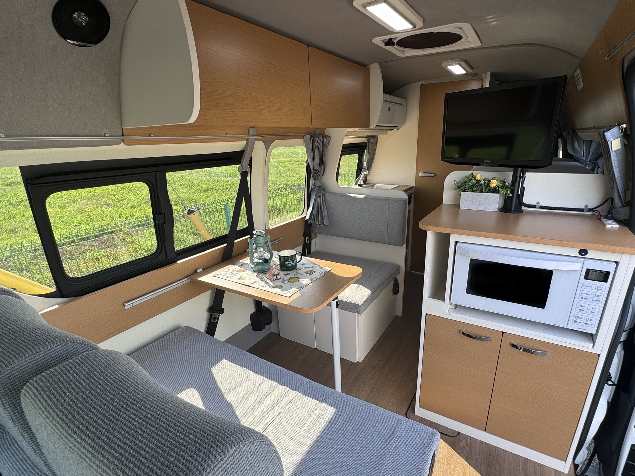 2段ベッドは走行時も着席可能なソファーにチェンジ